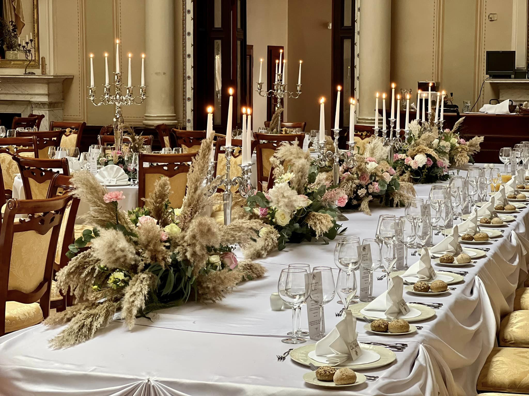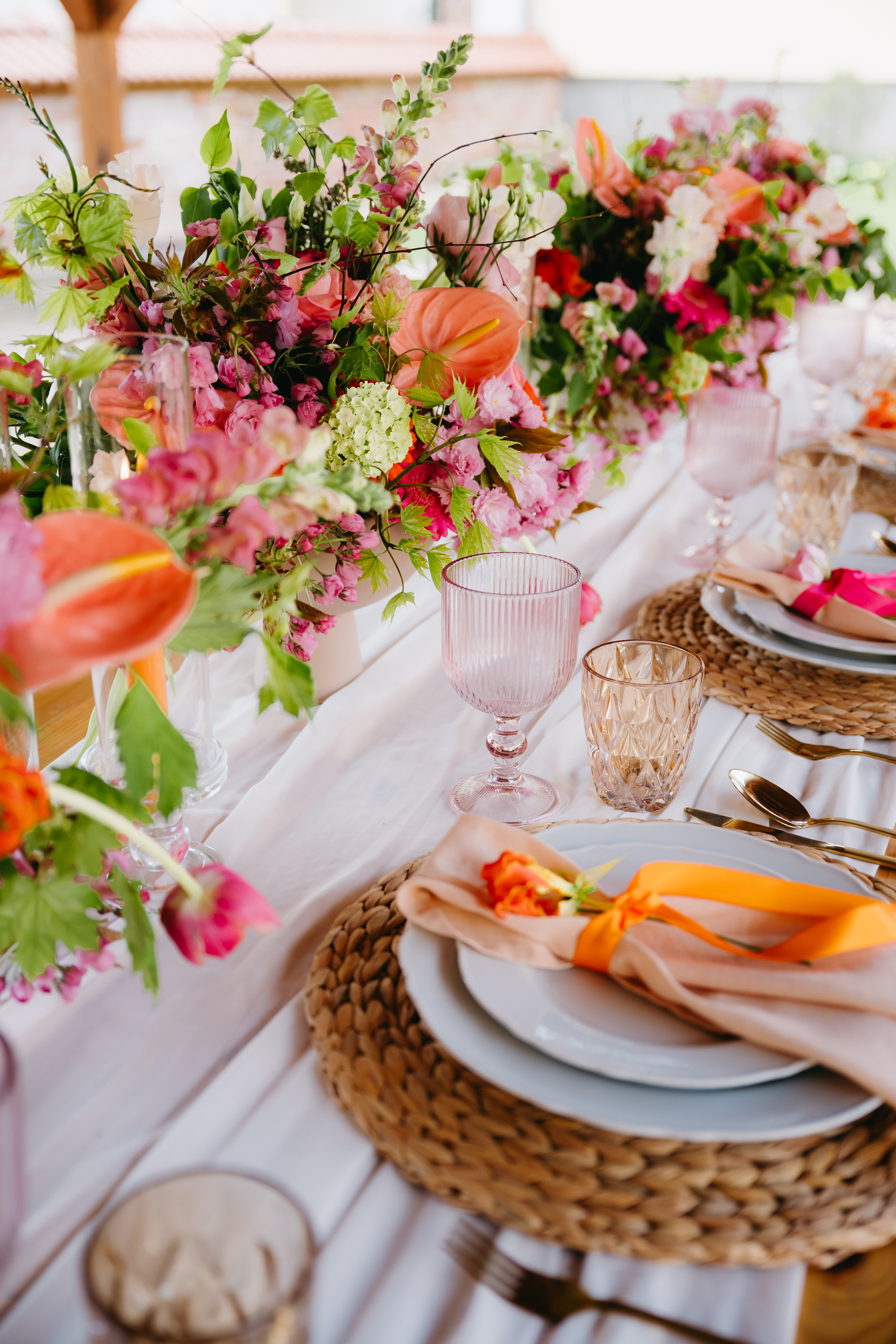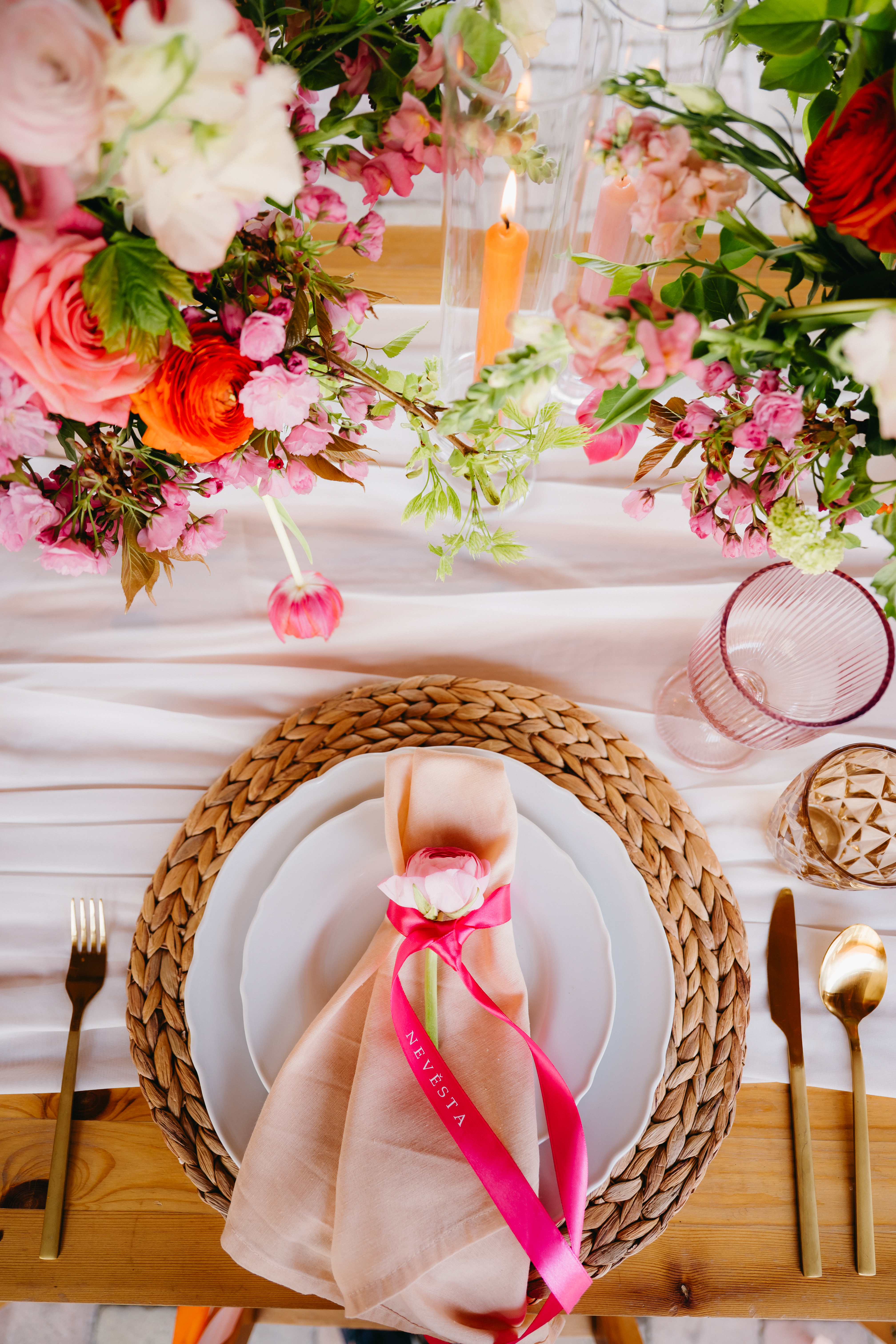 Květiny na stoly, jmenovky, ubrousky, vázy, svícny a další detaily