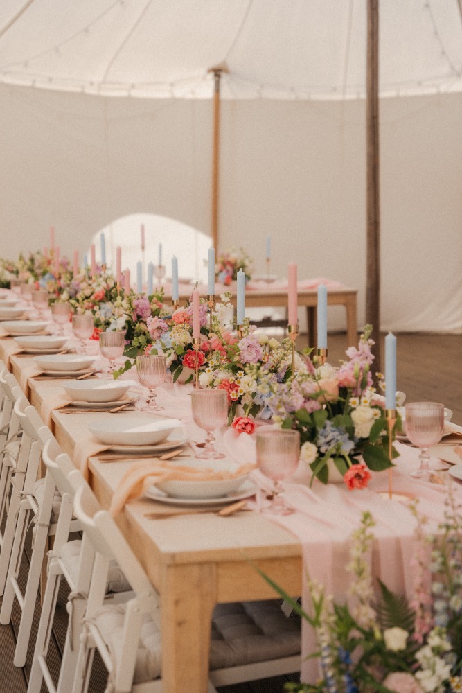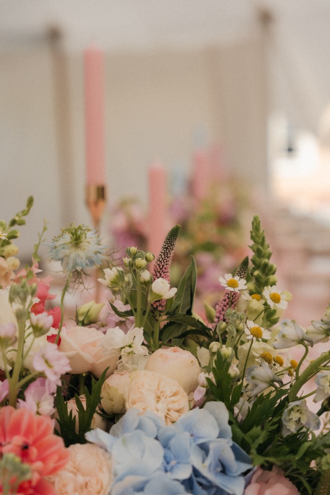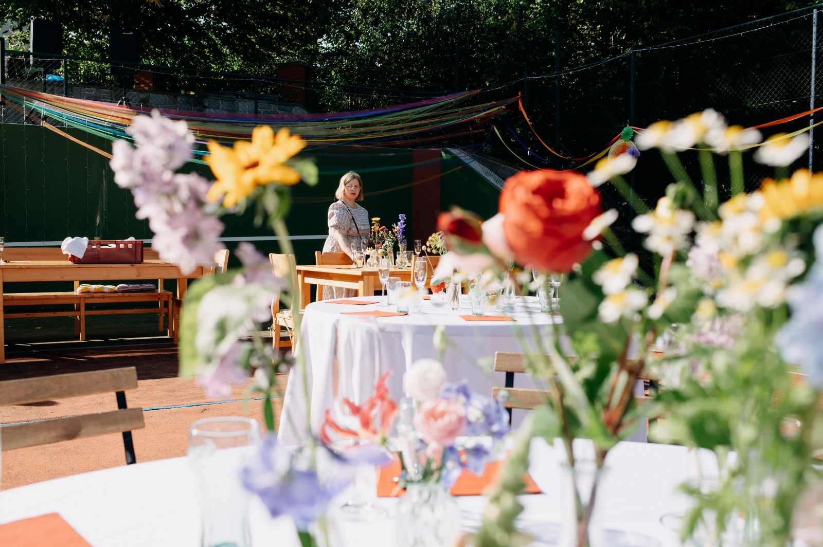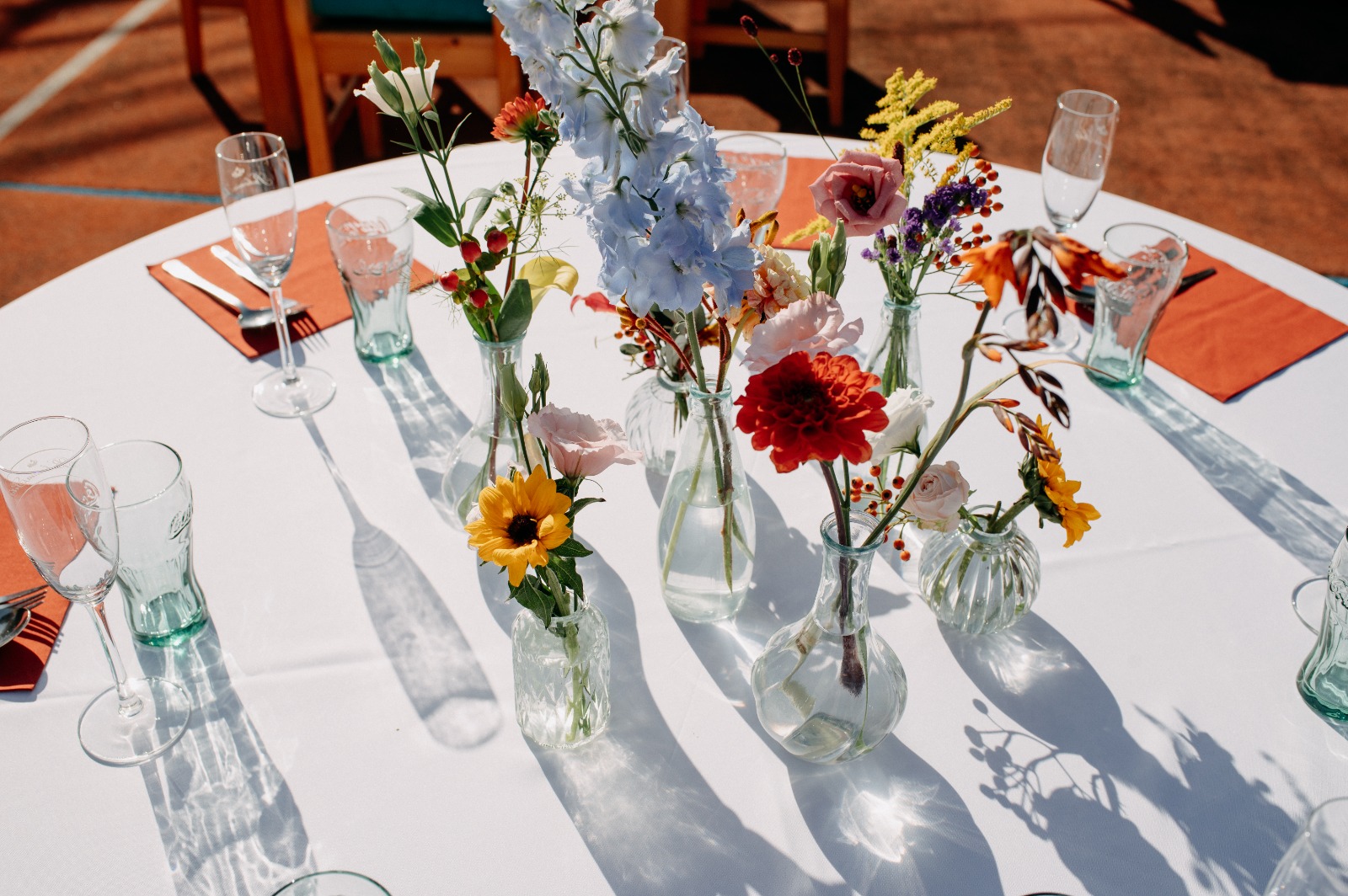 Květiny na stoly, jmenovky, ubrousky, vázy, svícny a další detaily